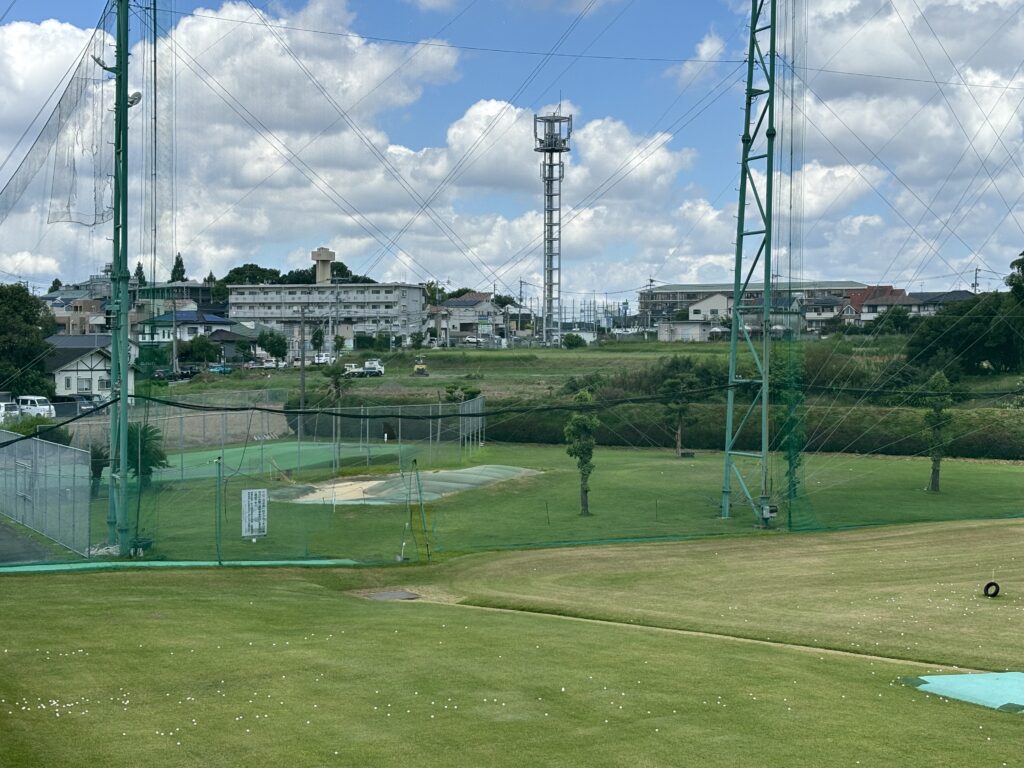 下写真は熊本県上益城郡益城町の広崎ゴルフクラブ(練習場)のアプローチ・バンカー・パッティングの練習スペースです。芝生の上から練習できますよ。