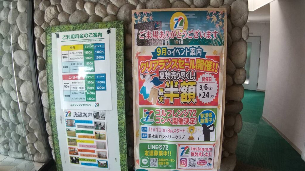 72ゴルフレンジ会場(熊本市南区富合町)は料金がリーズナブルで初めての人にも丁寧な対応で毎月色々なイベントが開催されています。またクラブハウス内にはゴルフ用品も販売されいて色々と相談に乗ってくれますよ。